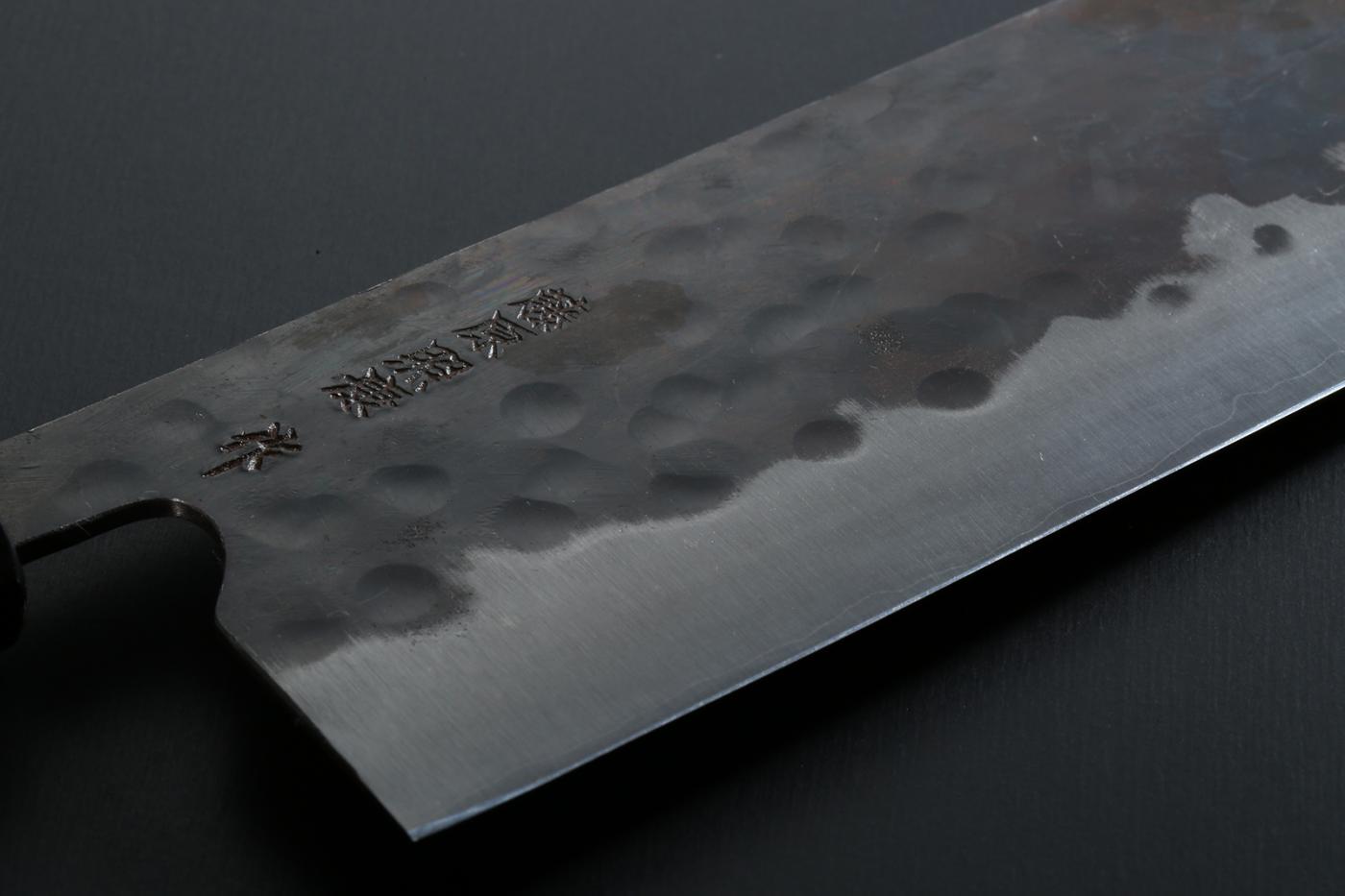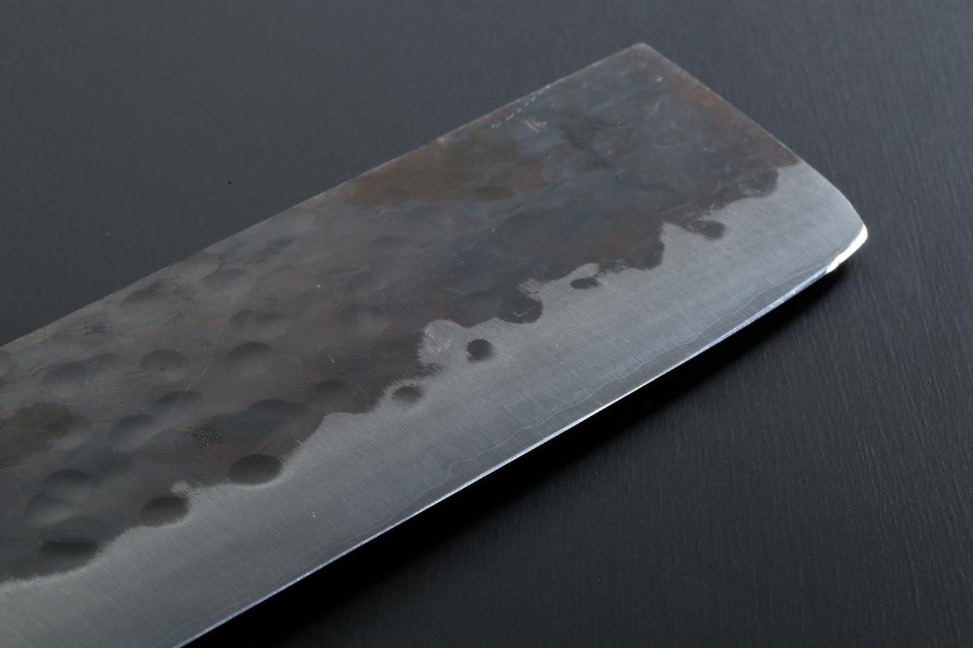 菜切包丁とは、呼んで字のごとく菜を切るために一番向いた形から菜切包丁と呼ばれ野菜刻みに威力を発揮します。 菜切包丁・《伝家の宝刀》シリーズはステンレスと最高級鋼(青紙スーパー)をサンドイッチした製造で表面加工は、打ち出し仕上げとなっております。当社でも最高級シリーズです。鋼(青紙スーパー)は通称、青紙と言われる青鋼を意味します。不純物の少ない白紙にタングステン、クロムを入れて造られた合金で刃物用に開発された最高級の鋼です。青紙は粘りや耐磨耗性があり、白紙より刃こぼれや、へたりが少ない事が特長です。当社では日立金属社の材料を原材料として使用しております。柄は洋式と和式からお選び頂けます。
